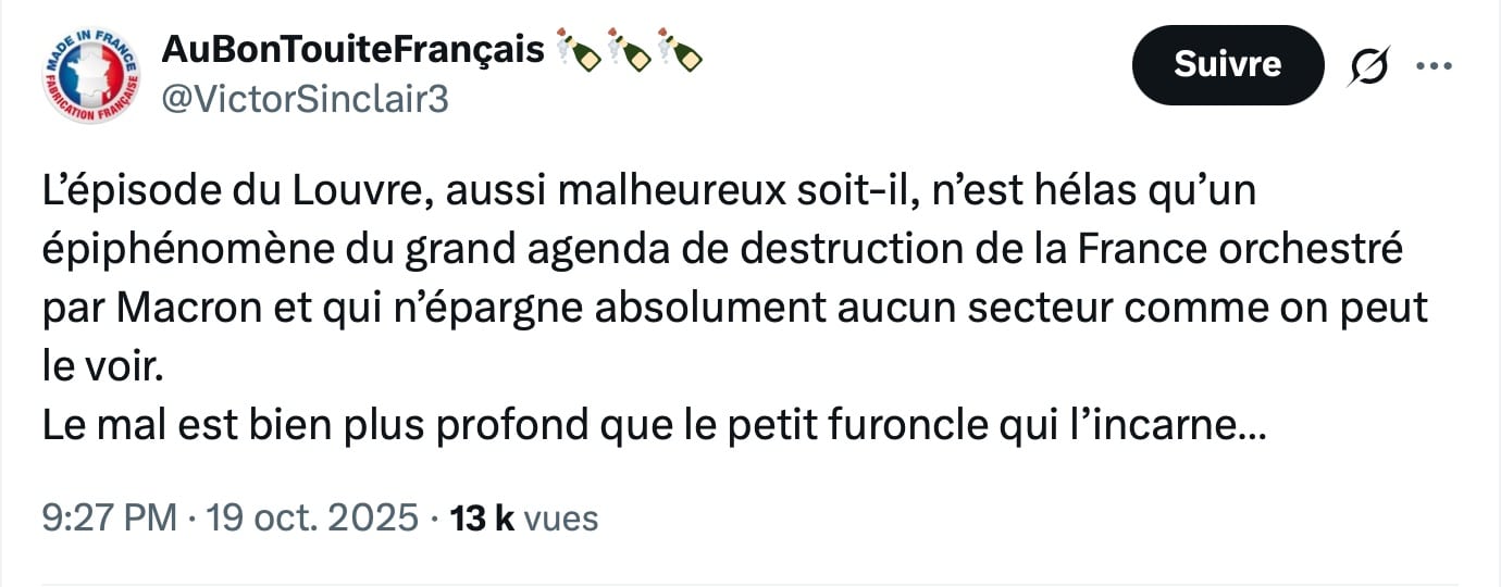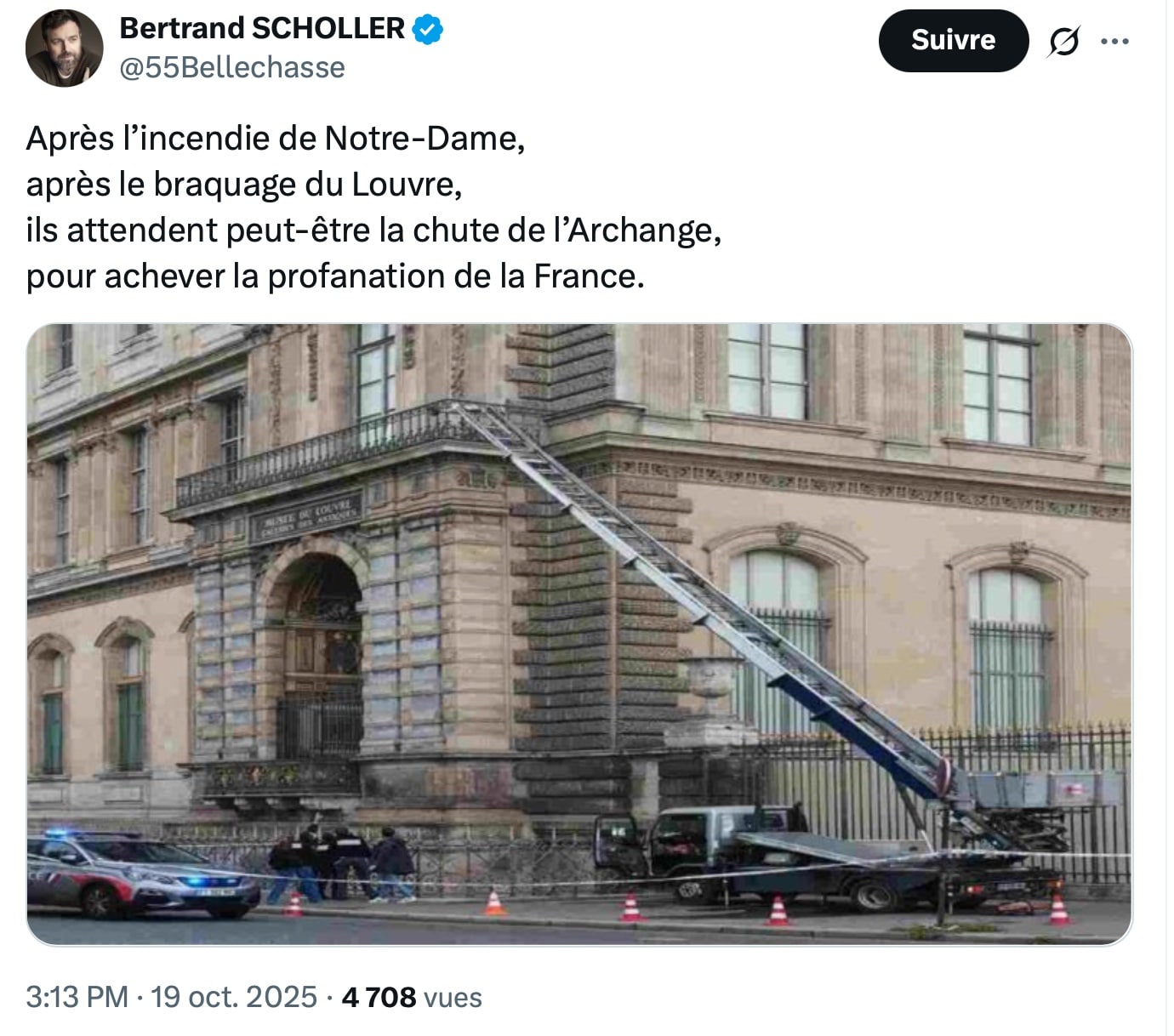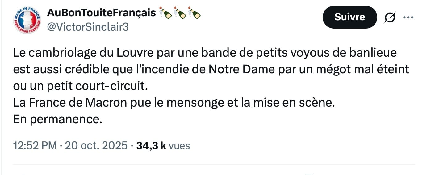 Dans la complosphère, l'analogie avec l’incendie de Notre-Dame a été immédiate. Ainsi, le compte X AuBonTouiteFrançais estime que cet « épisode du Louvre […] n’est hélas qu’un épiphénomène du grand agenda de destruction de la France orchestré par Macron et qui n’épargne absolument aucun secteur comme on peut le voir » tout en concluant notamment que « le cambriolage du Louvre par une bande de petits voyous de banlieue est aussi crédible que l'incendie de Notre-Dame par un mégot mal éteint ou un petit court-circuit. La France de Macron pue le mensonge et la mise en scène. En permanence ». Idem du côté de Bertrand Scholler : « Après l’incendie de Notre-Dame, après le braquage du Louvre, ils attendent peut-être la chute de l’Archange, pour achever la profanation de la France ». Richard Boutry y va lui aussi de sa théorie et fait même une allusion à Brigitte Macron. Le négationniste Vincent Reynouard parvient quant à lui à lier le cambriolage du Louvre à la Seconde Guerre mondiale... (sources : France 24, 24 octobre 2025 ; France 24, 22 octobre 2025).
