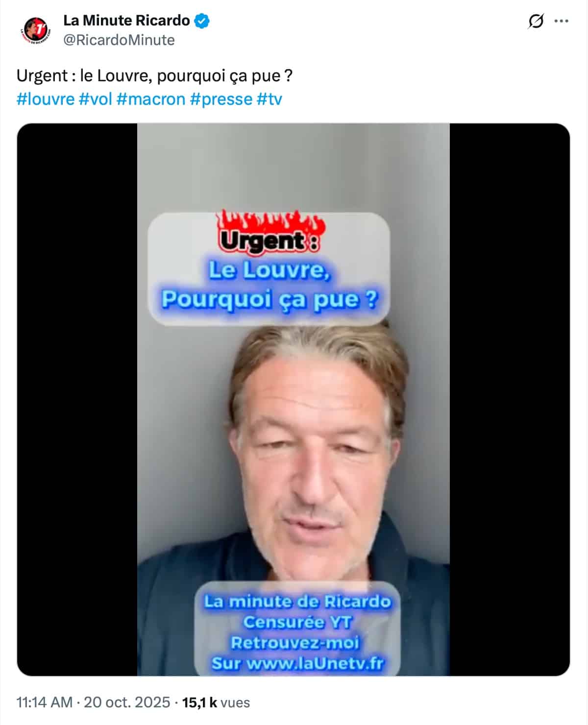 LOUVRE. Le vol des bijoux de la couronne au Louvre n'a pas manqué de susciter de nombreuses théories du complot. Depuis le cambriolage dimanche 19 octobre, de fausses vidéos générées par intelligence artificielle et censées montrer le moment du vol circulent en ligne. Ces contenus faux sont le plus souvent créés au moyen du générateur de vidéos Sora 2. Dans sa newsletter, NewsGuard explore l'hypothèse d'une « double opération sous fausse bannière », soulignant que, dans un acte de diversion confus, des sources pro-russes tentent de faire accuser la France d'avoir incriminé la Russie dans le cambriolage du Louvre. Les sources pro-Kremlin affirment à tort que les autorités françaises ont dissimulé un passeport russe près de l'échelle utilisée pour voler les joyaux de la couronne au Louvre, dans le but supposé de faire accuser la Russie de ce vol (source : NewsGuard, 22 octobre 2025).