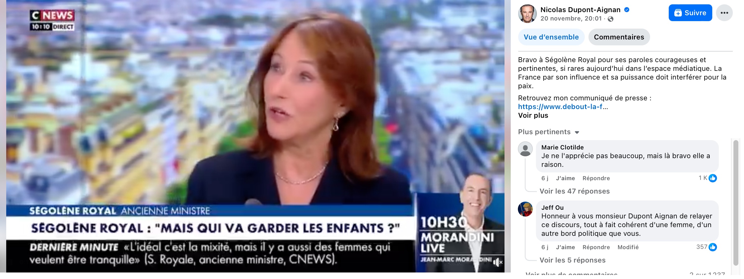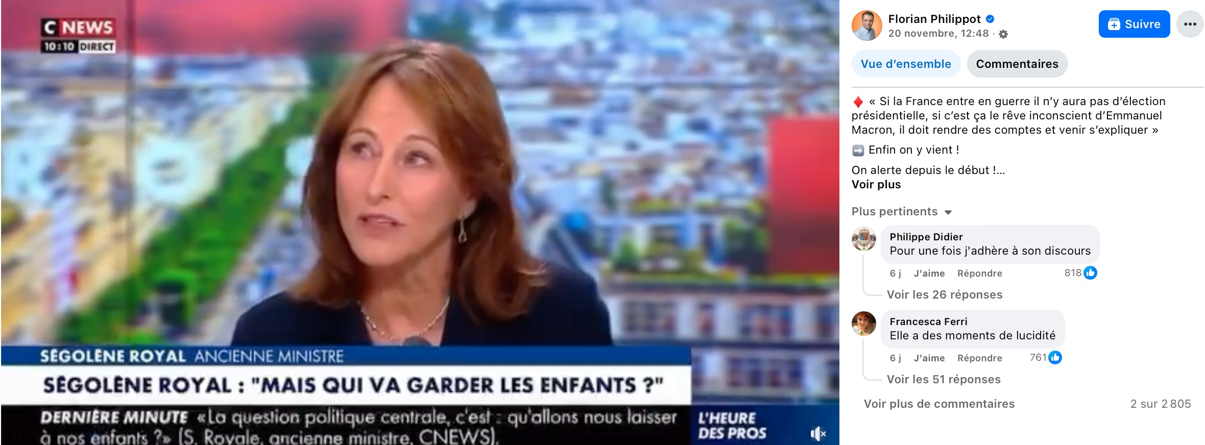 SÉGOLÈNE ROYAL. Elle est saluée par Florian Philippot [archive], Nicolas Dupont-Aignan [archive] ou encore Francis Lalanne. Invitée sur CNews le 20 novembre, Ségolène Royal a déclaré : « La France, elle doit être acteur de paix et pas acteur de guerre. Et c’est le contraire qui est en train de se passer. Pour semer la pagaille, peut-être pour se dire : "mais finalement si la France entre en guerre, il n’y aura pas d’élection présidentielle". Donc si c’est ça le rêve inconscient d’Emmanuel Macron, il doit rendre des comptes et venir s’expliquer. Et l’Assemblée nationale doit se saisir de ce problème pour savoir exactement ce qui se passe. On n’a pas le droit de faire peur à une nation toute entière. » L'ancienne candidate socialiste à l'élection présidentielle de 2007 commentait les propos du général Mandon, nouveau chef d'état-major des armées, qui avait affirmé deux jours plus tôt lors du congrès des maires de France que notre pays devait être prêt à « accepter de perdre ses enfants ».