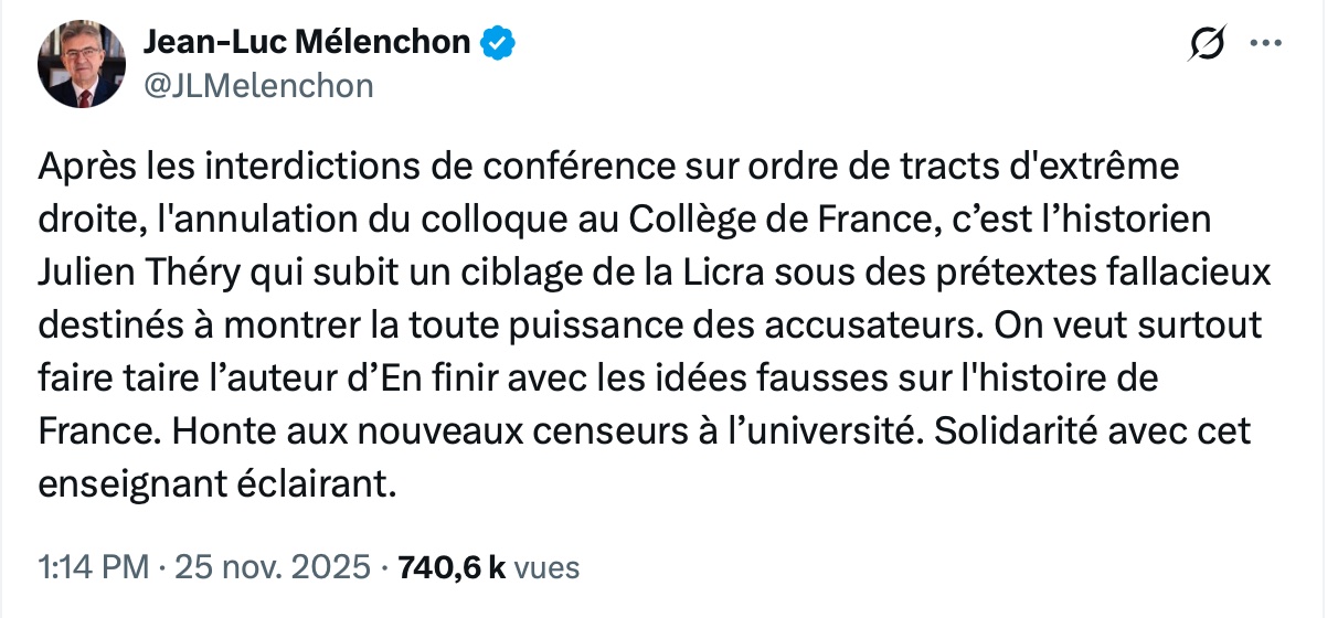 JULIEN THÉRY. L'Université Lyon 2 est secouée par la publication, par le professeur d'histoire médiévale et militant d'extrême gauche Julien Théry, d'un post comprenant une liste nominative de « 20 génocidaires à boycotter » et composée majoritairement de personnalités juives. Cette liste reprend les noms des 20 signataires d'une tribune appelant à attendre, pour reconnaître un État palestinien, la libération des personnes retenues en otage à Gaza et le démantèlement de l’organisation terroriste qui les avait enlevées lors du plus meurtrier massacre de Juifs depuis la Seconde Guerre mondiale. L’Université, qui a condamné « avec la plus grande fermeté » la publication de Julien Théry, a saisi officiellement le procureur de la République, reconnaissant par ailleurs à l’enseignant un « droit absolu d’expression à titre individuel » (source : Le Figaro, 24 novembre 2025). Le ministre de l’Éducation nationale Édouard Geffray a qualifié quant à lui de « profondément scandaleux » le message publié par Théry tout en apportant « [s]on soutien aux personnes qui ont été visées ». Jean-Luc Mélenchon a de son côté apporté son soutien à l'historien qui, selon lui, « subit un ciblage de la Licra sous des prétextes fallacieux destinés à montrer la toute puissance [sic] des accusateurs ». Le 23 octobre dernier, Julien Théry publiait sur le site de Hors-Série un texte affirmant que l'antisémitisme de gauche était une fake news. Pour Conspiracy Watch, l'historien et rédacteur en chef de la revue de la Licra Emmanuel Debono lui avait répondu (sources : Le Figaro, 24 novembre 2025 ; Le Monde, 26 novembre 2025).