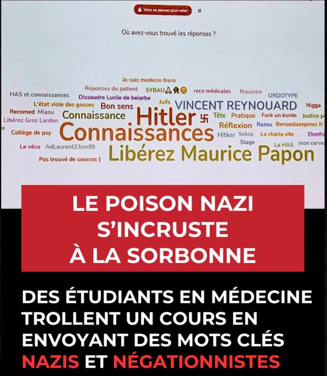 SORBONNE. L'université de La Sorbonne à Paris a quant à elle annoncé le 24 novembre avoir saisi la justice après des « propos antisémites et faisant l’apologie du nazisme » tenus lors d'un cours magistral à la faculté de santé quelques jours avant. Sur une photographie, des réponses au Wooclap relayée sur X par Manès Nadel, cofonfondateur et ancien président de l'Union syndicale lycéenne, des références précises liées à l’extrême droite la plus radicale et complotiste apparaissent comme celles à Vincent Reynouard ou encore à « Libérez Gros Lardon » (pseudonyme du militant néonazi Léo Rivière-Prost). On y aperçoit également une croix gammée et les mentions « Juifs » ou « Libérez Maurice Papon » (sources : franceinfo, 24 novembre 2025 ; Manès Nadel/X, 22 novembre 2025).