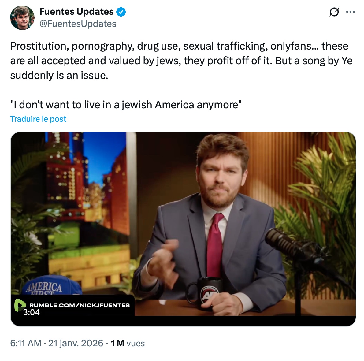 NICK FUENTES. Il a déclaré sur X ne plus vouloir « vivre dans une Amérique juive ». Le suprémaciste Nick Fuentes a rompu violemment avec Donald Trump, lui reprochant de ne pas incarner une figure aussi radicale qu'Adolf Hitler. Cette critique s'appuie sur une grille de lecture antisémite où Trump est accusé d'être devenu le jouet d'une prétendue « cabale sioniste » infiltrée à la Maison Blanche. En dénonçant ce qu'il considère comme une trahison, Fuentes alimente l'idée d'un complot interne qui empêcherait l'instauration d'un ordre racial suprémaciste. Pour lui, l'échec de Trump à devenir ce « messie autoritaire » prouve que seule une révolution idéologique raciale pourrait briser les chaînes du « mondialisme » (source : Forward, 16/01/2026).