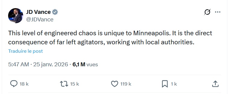 CONSPICRATIE. L'avènement de la conspicratie américaine se poursuit, un an après l'installation à la Maison Blanche de Donald Trump. Sa rhétorique sature l'espace public de récits paranoïaques notamment sur le « Deep State », le climat (présenté comme un canular mondialiste) et la réécriture de l'histoire des émeutes du Capitole. Cette semaine n'a pas dérogé à la règle. Ainsi, le compte X de la Maison Blanche a publié une photo sans préciser qu’elle avait été truquée à l’aide d’une IA. On y voit l’avocate spécialisée dans les droits civiques, Nekima Levy Armstrong, arrêtée dans le Minnesota, en larmes et présentée comme une « agitatrice d’extrême gauche » (sources : Le Monde, 23/01/2026 ; TF1 INFO, 18/01/2025). Commentant la mort d'un infirmier américain tué à Minneapolis par la police de l'immigration samedi 24 janvier, le vice-président JD Vance a déclaré : « Ce niveau de chaos orchestré est propre à Minneapolis. Il est la conséquence directe d'agitateurs d'extrême gauche, en collaboration avec les autorités locales »...