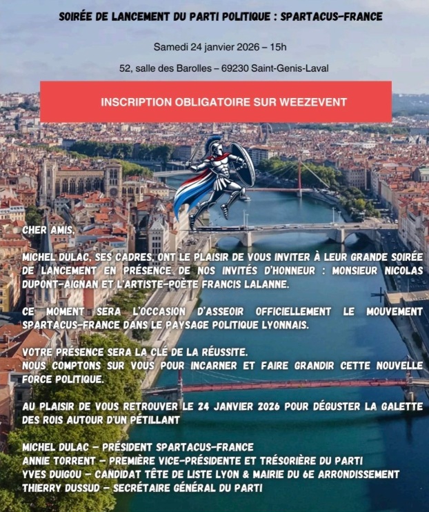 POLITIQUE. Même s'il est frappé d'inéligibilité, Francis Lalanne envisagerait de se porter candidat à Lyon sous la bannière du mouvement Spartacus, fondé et dirigé par Michel Dulac, ancien conseiller régional RN. La première réunion publique de ce nouveau parti était prévue ce samedi 24 janvier en présence de... Nicolas Dupont-Aignan (source : Le Parisien, 20/01/2026).