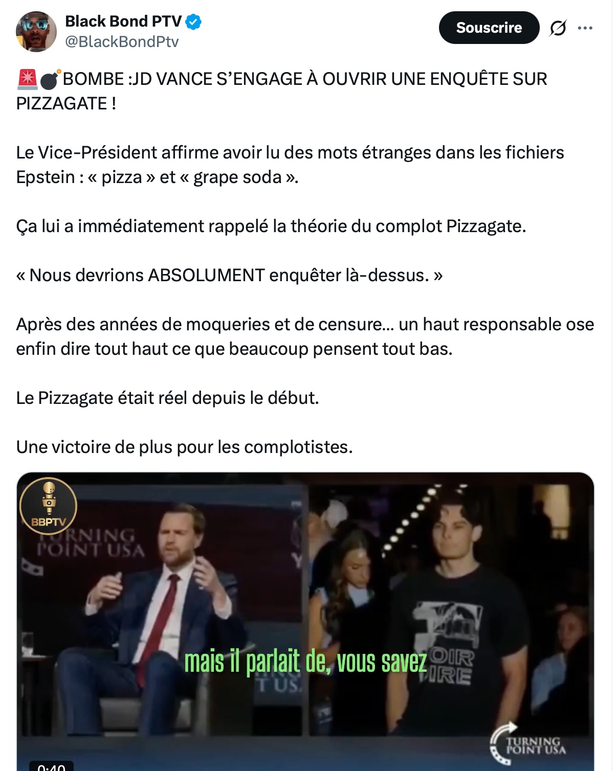 PIZZAGATE. Le vice-président JD Vance a publiquement appelé à enquêter sur une personne liée au « Pizzagate », faisant référence à des e-mails issus des dossiers Epstein. Ses propos ont été interprétés comme une réactivation implicite de ce récit conspirationniste. Sur X, Black Bond PTV s'en est félicité : « après des années de moqueries et de censure… un haut responsable ose enfin dire tout haut ce que beaucoup pensent tout bas. Le Pizzagate était réel depuis le début. Une victoire de plus pour les complotistes » (source : International Business Times, 15/04/2026).