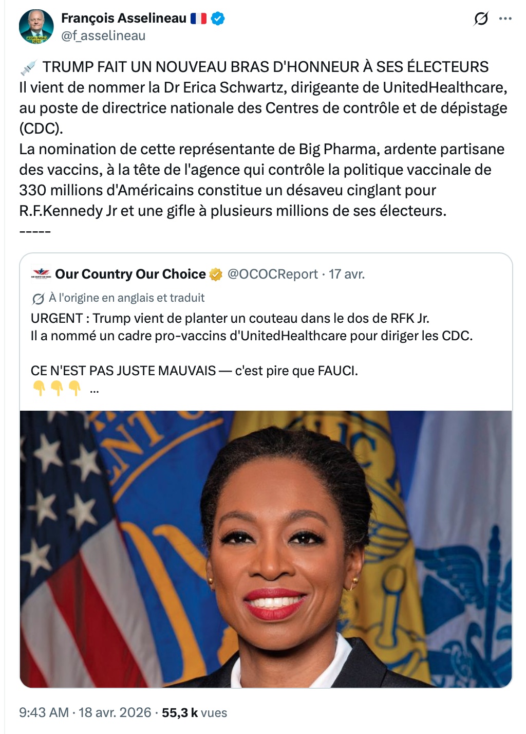 Et on ne peut pas dire qu'elle réjouisse certaines figures de la complosphère comme François Asselineau qui considère sur X que « TRUMP FAIT UN NOUVEAU BRAS D'HONNEUR À SES ÉLECTEURS » avec cette nomination d'une personne qu'il qualifie de « représentante de Big Pharma »...