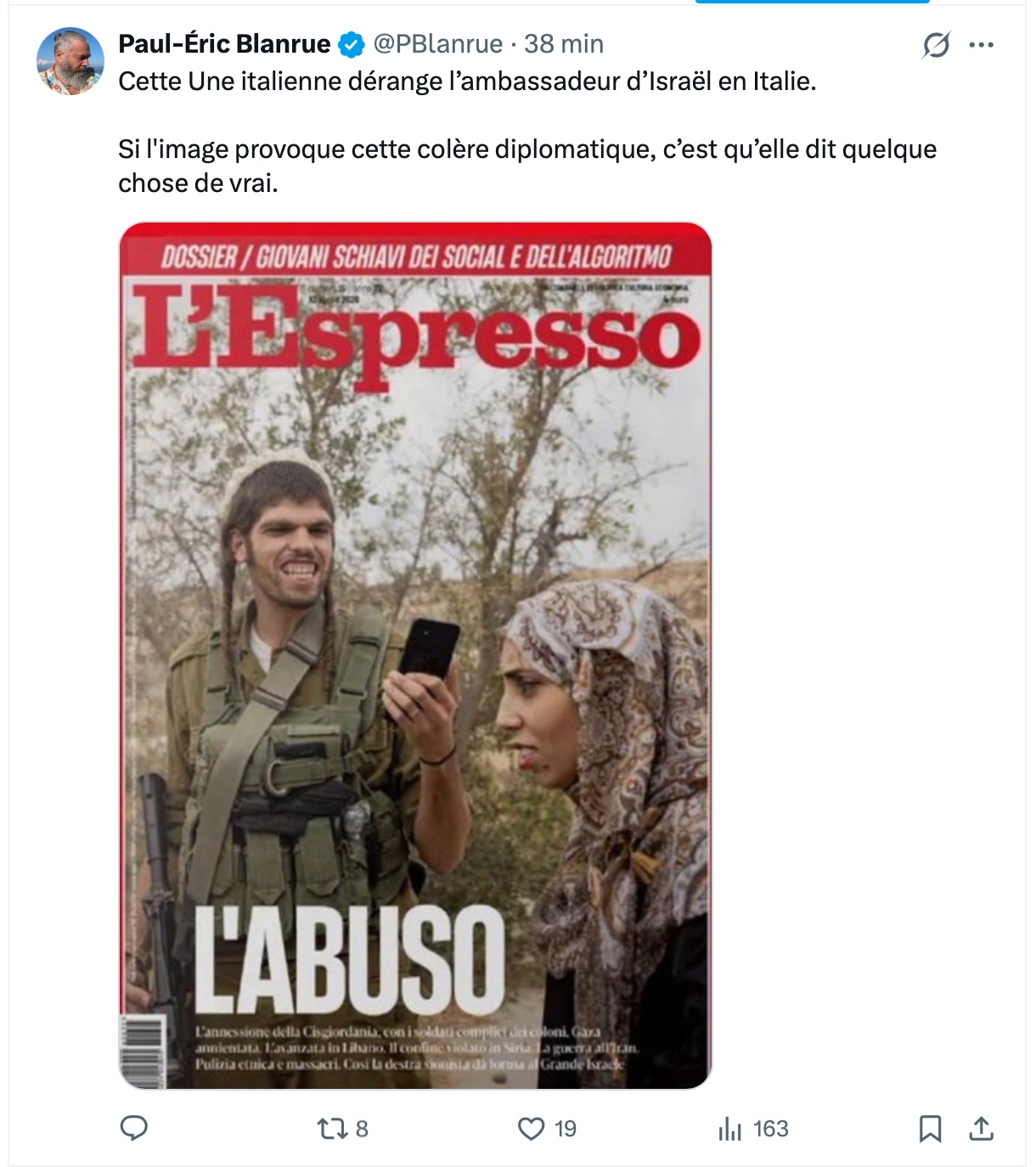 En partant de l'image originale proposée par Trump, Silvano Trotta en a proposé une autre sur X, générée par l'IA aussi, s'inspirant fortement de la Une du magazine italien Espresso représentant un colon israélien en tenue militaire, une arme à la main, pointant son smartphone sur une Palestinienne et semblant se moquer d'elle, qui avance tête baissée. Une photo qui a créé une polémique (source : franceinfo, 15/04/2026).