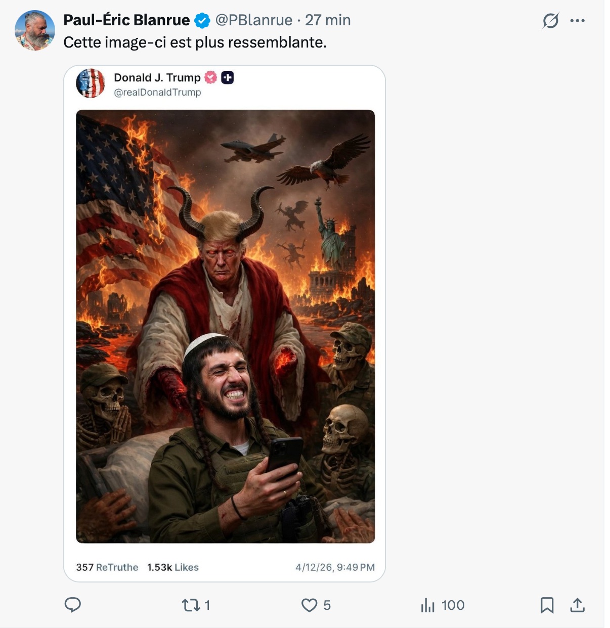 Le 23 avril, dans l'une de ses vidéos en réponse à un message publié par Trump le jour de Pâques, dans lequel le président menaçait de détruire des infrastructures stratégiques en Iran, Tucker Carlson a laissé entendre que la guerre menée par l'administration Trump contre l'Iran était également une guerre contre la foi chrétienne. Bien qu'il n'ait jamais prononcé le mot « Antéchrist » dans la vidéo, des personnalités des médias MAGA comme Alex Jones ainsi que des utilisateurs du subreddit DonaldTrump666 ont estimé que Carlson insinuait que Trump était l'Antéchrist. Le chiffre 666 est bien connu de la complosphère : c'est une allusion au chiffre de la Bête (source : Wired,13/04/2026).