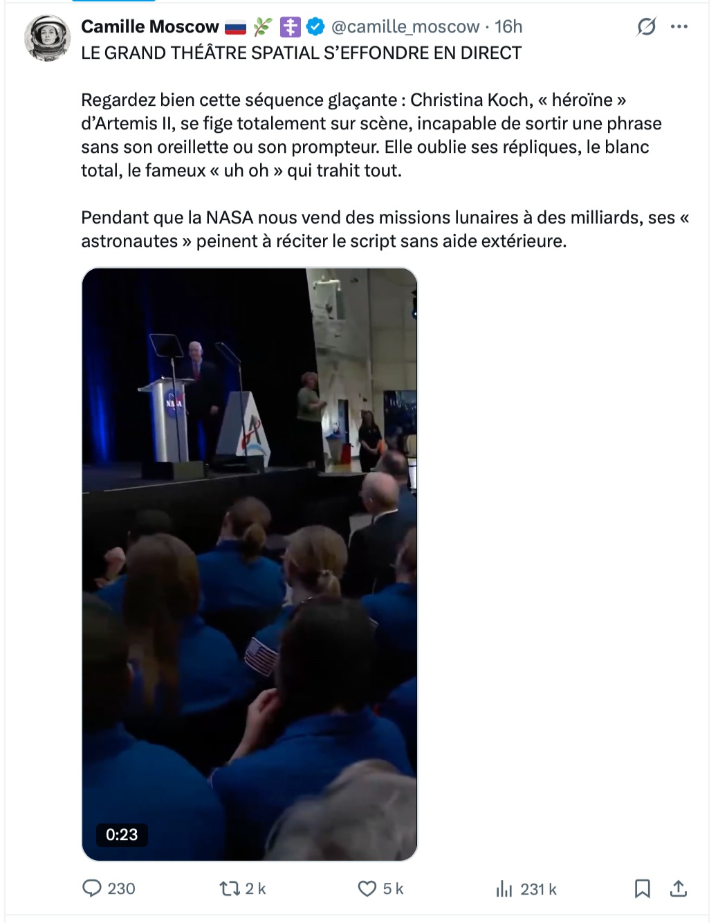 ARTEMIS II. La vague conspirationniste qui a accompagné la mission Artémis II se poursuit. Le compte X complotiste Camille Moscow revient sur la conférence de presse (qualifiée de « grand théâtre spatial ») donnée par les astronautes, identifiés à des acteurs. « Pendant que la NASA nous vend des missions lunaires à des milliards, ses « astronautes » peinent à réciter le script sans aide » peut-on lire.