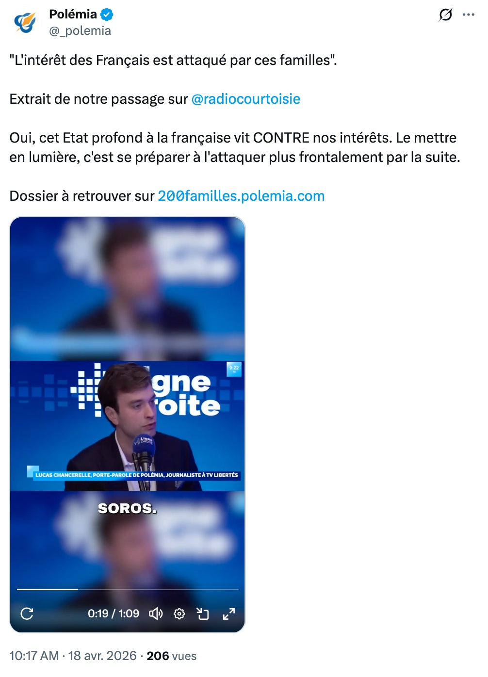« 200 FAMILLES ». Polémia a mis en ligne une cartographie interactive sur « Les 200 familles qui gouvernent la France ». Sur Radio Courtoisie, Lucas Chancerelle, porte-parole de Polemia et journaliste pour TV Libertés, estime que « l'intérêt des Français est attaqué par ces familles, par les Duhamel, par les Glucksmann, par cette administration payée par l'argent des Français […]. Oui, cet État profond à la française vit contre nos intérêts. Le mettre en lumière, c'est se préparer à l'attaquer plus frontalement par la suite ». Le nom de George Soros est également cité [archive].