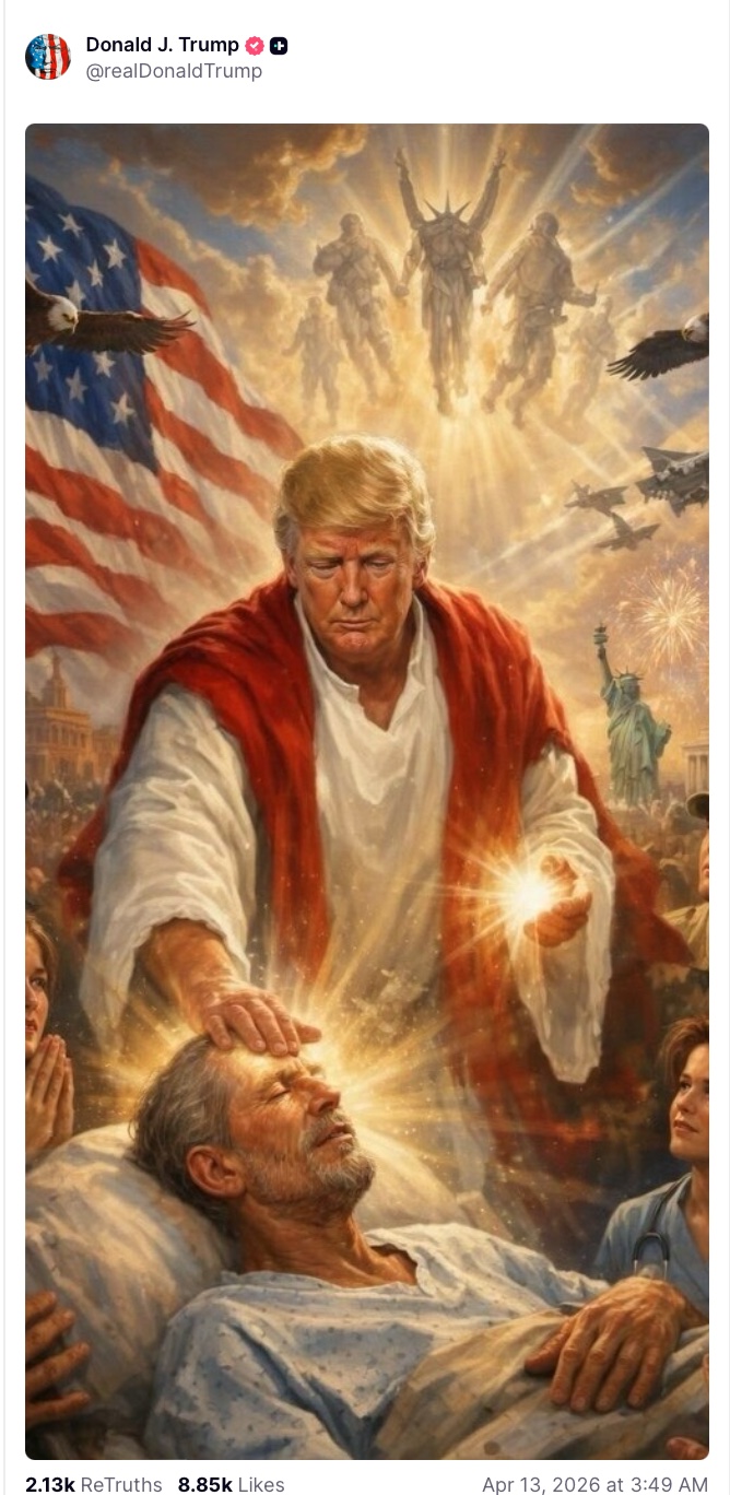 DONALD TRUMP. Devenue virale, sa publication sur Truth Social (qu'il a supprimée) de l'image le représentant en Jésus-Christ guérissant un malade a suscité de nombreuses réactions. Quand les journalistes lui ont demandé s'il s'excusait, Donald Trump a répondu : « Seuls les [médias de] fake news pouvaient sortir ça. C'est censé me représenter en médecin qui rend les gens meilleurs. Et je rends les gens meilleurs, vraiment meilleurs » (source : cginisty/X, 15/04/2026).