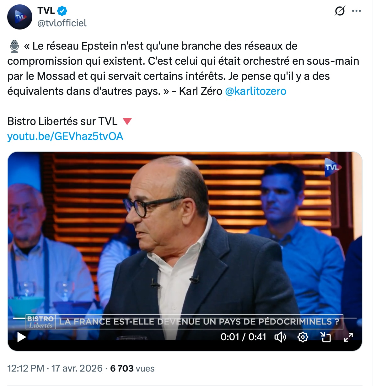 KARL ZÉRO. Dans l'émission « Bistro Libertés » sur TV Libertés, Karl Zéro dit sa conviction que Jeffrey Epstein travaillait pour le compte du Mossad.