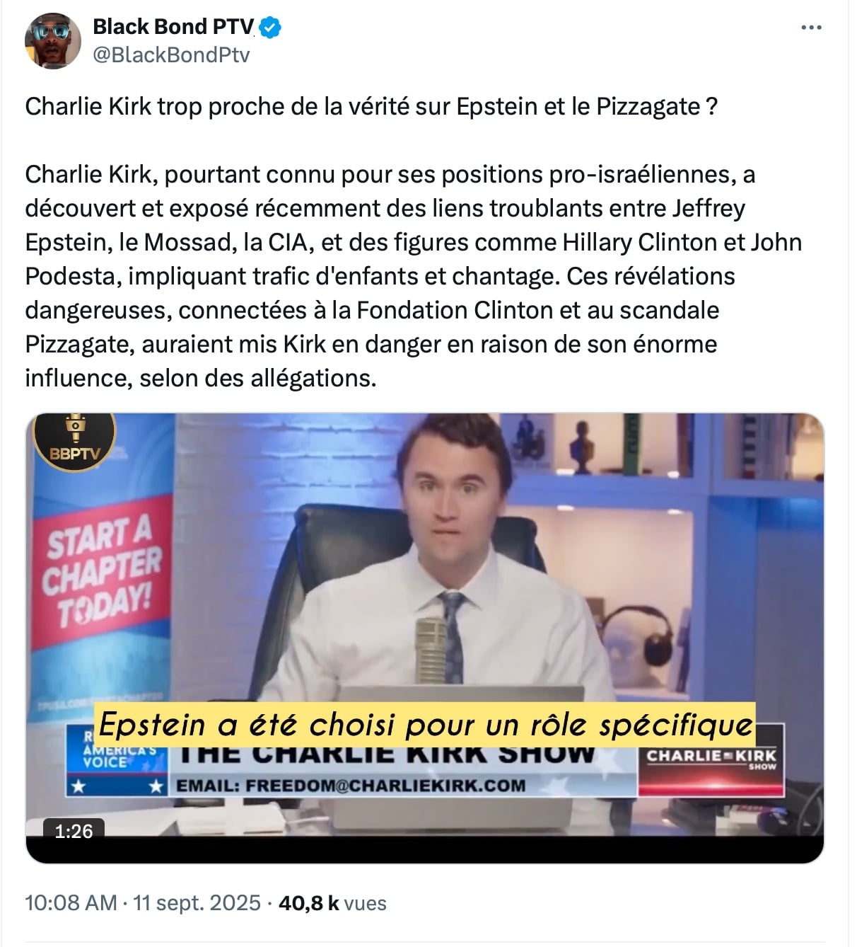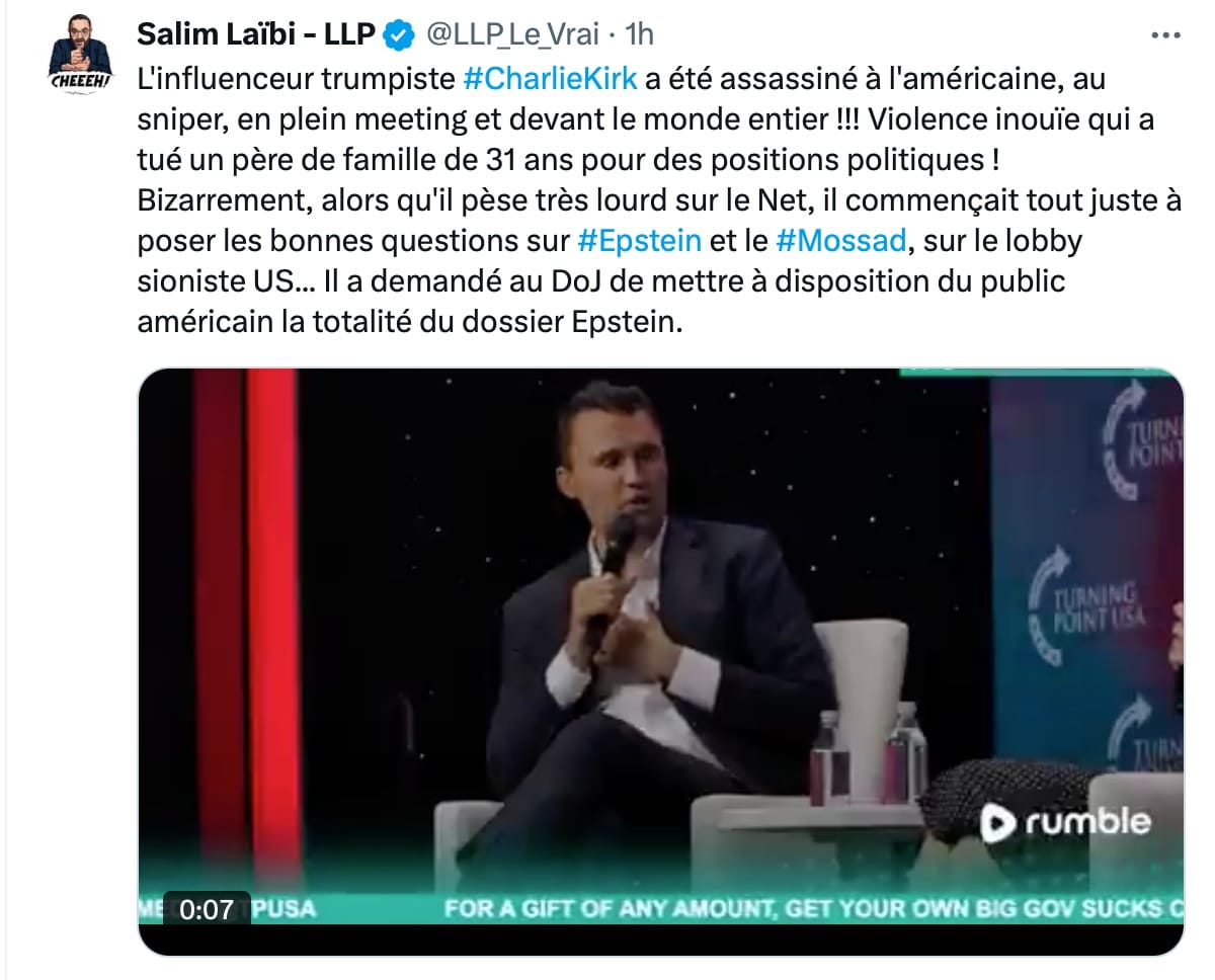 ➡️ C’est la théorie qui a envahi les réseaux sociaux, quelques heures seulement après l’annonce de l’assassinat du commentateur américain pro-Trump.#Thread 🧵 pic.twitter.com/KaFMK3OAx4— Conspiracy Watch (@conspiration) September 11, 2025