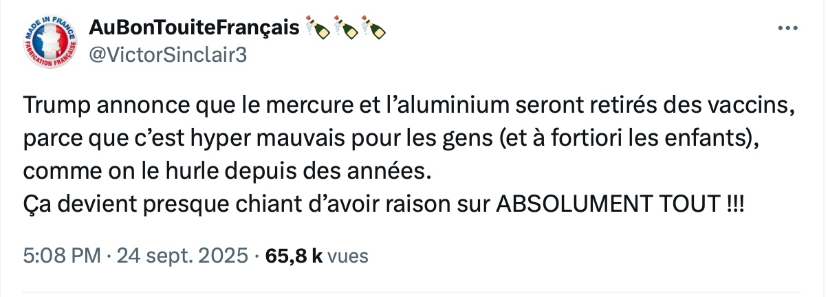 Pour certains, les mensonges trumpistes ne posent aucun problème. Ainsi, le compte X AuBonTouiteFrançais (137 000 abonnés) s'est félicité des propos du président américain : « Trump annonce que le mercure et l’aluminium seront retirés des vaccins, parce que c’est hyper mauvais pour les gens (et a fortiori les enfants), comme on le hurle depuis des années. Ça devient presque chiant d’avoir raison sur ABSOLUMENT TOUT !!! » (archive) (sources : Radio Canada, 22 septembre 2025 ; Raphael Grably/X, 22 septembre 2025 ; France 24, 23 septembre 2025 ; FactPost/X, 22 septembre 2025 ; Le Parisien, 22 septembre 2025 ; Victor Mottin/X, 25 septembre 2025 ; The New York Times, 25 septembre 2025 ; Conspiracy Watch/X, 27 septembre 2025).