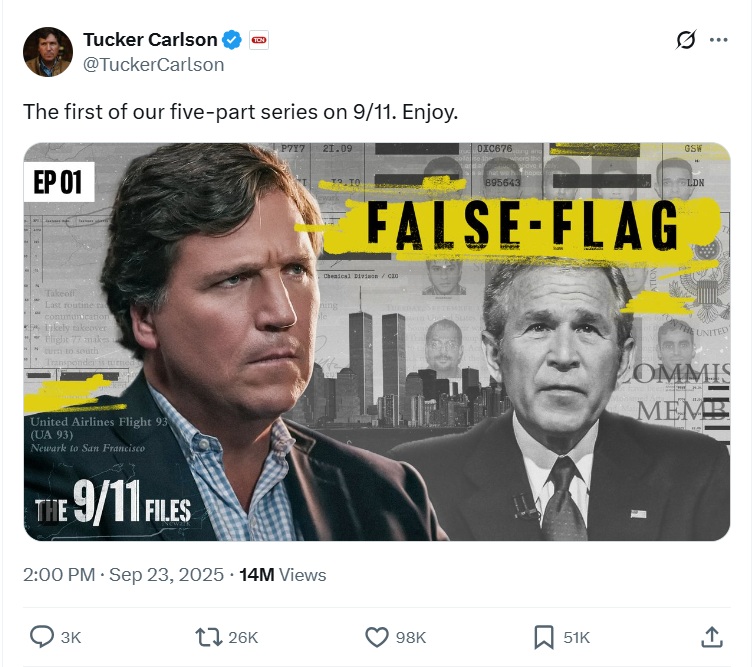 11-SEPTEMBRE. Tucker Carlson lance une série sur les attentats du 11 septembre 2001, appelant à rouvrir l'enquête sur ces attaques terroristes, les plus meurtrières de l'histoire américaine. Son post affiche plus de 14 millions de vues à ce jour (source : Tristan Mendès France/X, 25 septembre 2025).