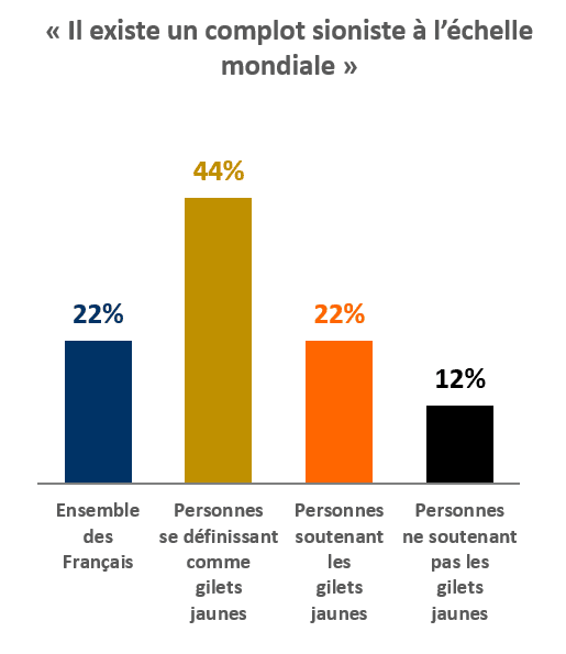 En décembre 2018, Conspiracy Watch et la Fondation Jean-Jaurès ont commandité, pour la deuxième année consécutive, une enquête d’opinion sur le complotisme en France auprès de l’Ifop. Parmi les différentes théories du complot soumise à un échantillon représentatif de 1760 personnes, l’affirmation « il existe un complot sioniste à l’échelle mondiale » a à nouveau été proposée. Il résulte de cette enquête que 22% des sondés sont d’accord avec cet énoncé (7% « tout à fait d’accord », 15% « plutôt d’accord » et 32% sans opinion). 33% de ceux qui avaient déjà entendu parler de cette thèse avant l’enquête l’approuvent (contre 13% chez ceux qui n’en avaient jamais entendu parler auparavant sachant qu’environ la moitié des participants de l’enquête ne connaissait pas cette thèse).