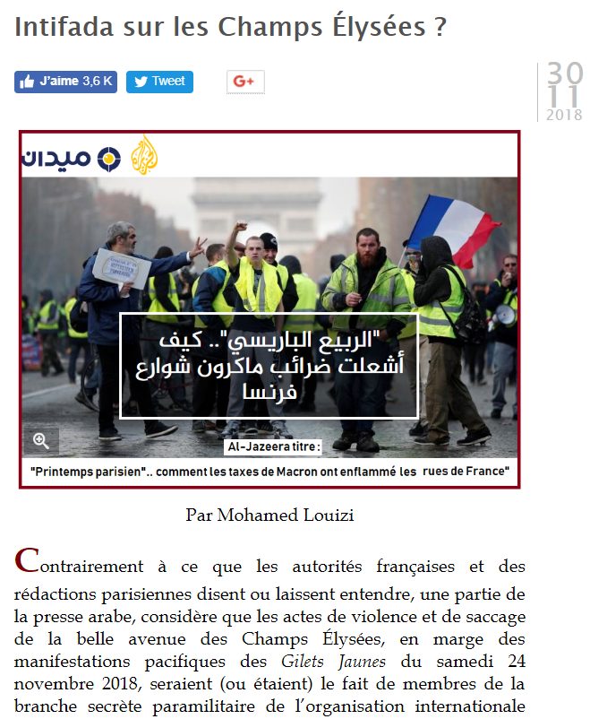 Toutefois, il faut dire que les mouvements identitaires, plutôt hostiles à l’islam, aux musulmans, aux migrants et aux étrangers, parlent moins, en ces temps de grogne montante, des islamistes. En tout état de cause, ils ne leur attribuent certainement pas la paternité du mouvement des Gilets jaunes ni même son infiltration…à l’exception notable de Mohamed Louizi. dans un texte intitulé « Intifada sur les Champs Élysées ? ».