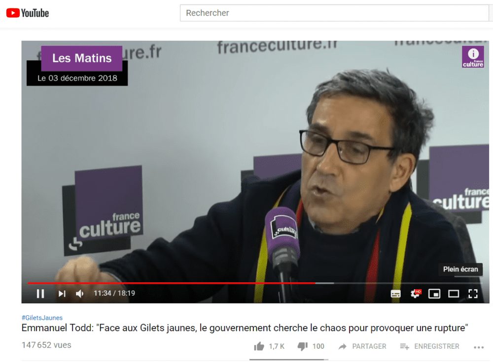 Emmanuel Todd (capture d’écran YouTube/France Culture, 03/12/2018).