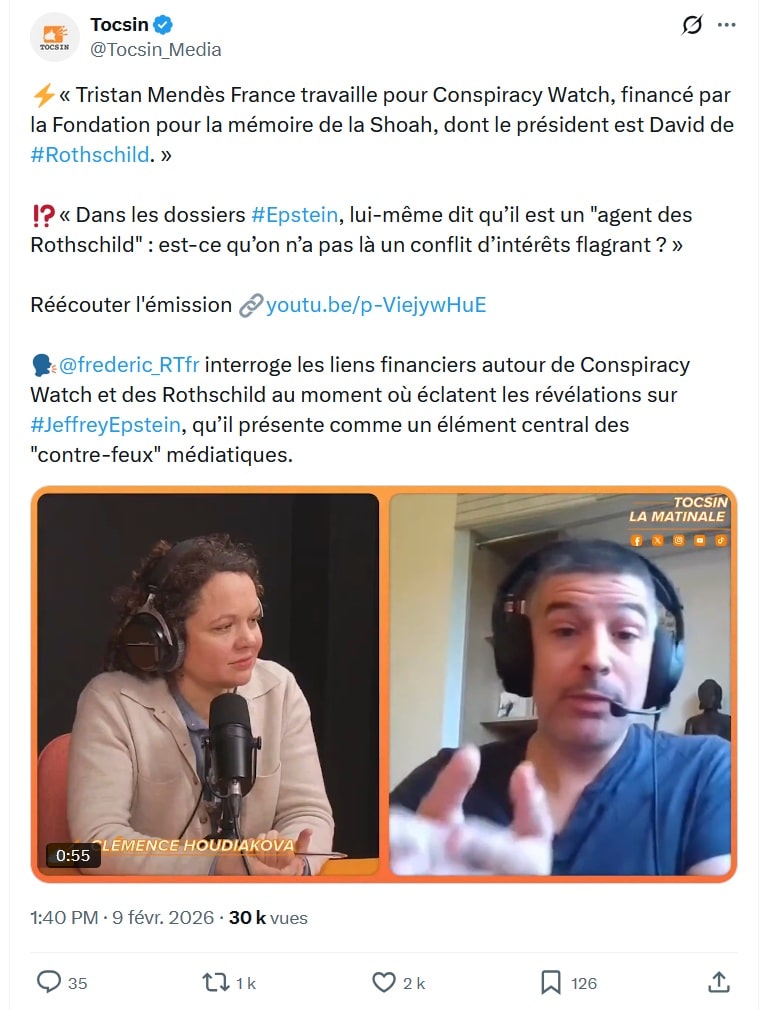 On travestit nos analyses, on invente purement et simplement des citations destinées à mettre dans notre bouche des mots que nous n'avons jamais prononcés. Déçu de ne pas trouver le moindre lien entre nous et Jeffrey Epstein, on souligne le fait que nous sommes soutenus financièrement depuis quelques années par la Fondation pour la Mémoire de la Shoah (FMS). Pourquoi ? Tenez-vous bien. Le financier américain échangeait des e-mails avec Ariane de Rothschild, épouse (et aujourd'hui veuve) de Benjamin de Rothschild (1963-2021), l'héritier de la branche suisse de la famille Rothschild. Or, l'un des anciens président de la FMS s'appelle David de Rothschild. Il n'appartient pas à la branche suisse de la dynastie et n'avait de toute façon pas d'interaction avec Jeffrey Epstein. Mais, pour les complotistes, ce patronyme partagé est une preuve de collusion et, par extension, un motif suffisant pour entacher l'indépendance éditoriale de Conspiracy Watch !