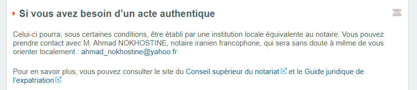 De manière insolite, le site de l'ambassade de France à Téhéran renvoie à un dénommé Ahmad Nokhostine, « notaire iranien francophone », en cas de besoin d'un acte notarié authentique :