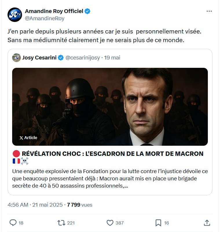 Le 21 mai 2025, elle relaie une fausse information provenant d'une officine de désinformation russe se présentant comme une organisation de défense des droits humains (la Fondation pour combattre l'injustice) et relayée par Profession Gendarme, selon laquelle l'Elysée aurait mis en place une brigade secrète de 40 à 50 assassins professionnels, un « escadron de la mort » chargé d'éliminer les opposants politiques à Emmanuel Macron. Elle assortit cette publication de ce commentaire : « J'en parle depuis plusieurs années car je suis personnellement visée. Sans ma médiumnité clairement je ne serais plus de ce monde » [archive].