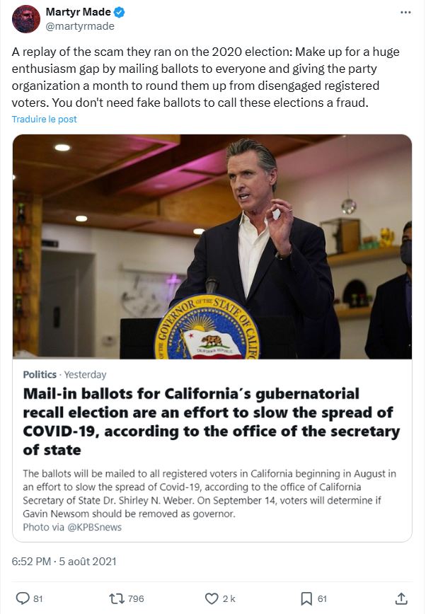 Ce thread a fonctionné comme un levier d’amplification massive de la visibilité de Darryl Cooper, qui est passé de 7 000 à 70 000 abonnés sur la plateforme en quatre jours seulement et qui l’a positionné du jour au lendemain comme voix légitime du camp conservateur. Plutôt que de défendre frontalement la thèse complotiste de la fraude électorale, Cooper a transformé l’argumentaire conspirationniste en déplaçant la focale sur la « responsabilité » des institutions dans le sentiment d’usurpation et de trahison des électeurs. Même si dans le fil qui l’a rendu célèbre, Cooper n’adhère pas directement à la thèse complotiste des élections volées, il déclare un mois plus tard sans équivoque que les élections de 2020 sont « une escroquerie » (« a fraud »).