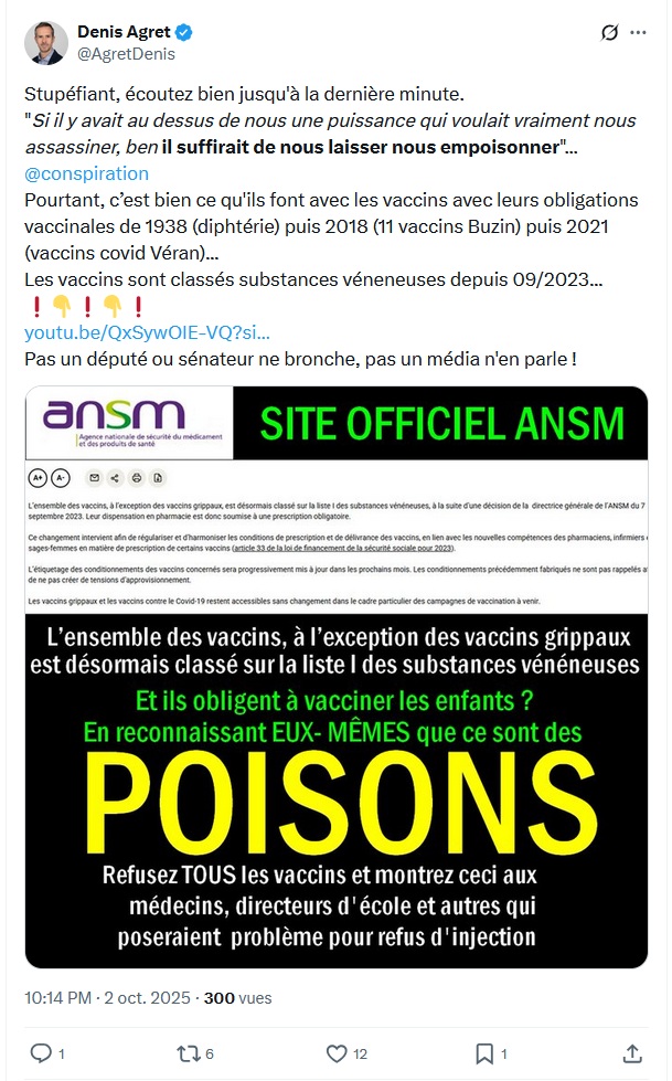 Le 2 octobre 2025, il suggère que l'obligation vaccinale est comparable à un empoisonnement, arguant que la plupart des vaccins sont classés sur la liste I des substances vénéneuses [archive]. En réalité, « substance vénéneuse » est un terme réglementaire du Code de la santé publique qui, selon le service de presse de l'Agence nationale de sécurité du médicament et des produits de santé (ANSM), « n'est pas du tout apparenté à une notion de danger ou de toxicité ». La décision de placer ces vaccins comme « substance vénéneuse » avait pour but de permettre aux pharmaciens, aux infirmiers et aux sages-femmes des les prescrire.