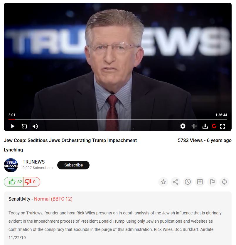 Dans une vidéo de novembre 2019 intitulée « Jew Coup: Seditious Jews orchestrating Trump Impeachment » (« Coup d’État du Juif : quand des Juifs séditieux orchestrent la destitution de Trump »), Wiles accuse les Juifs d’être derrière la procédure de destitution de Donald Trump initiée en décembre 2019 au Sénat américain. Supprimée de toutes les plateformes traditionnelles de diffusion, dont le site TruNews, la vidéo demeure disponible sur BitChute.