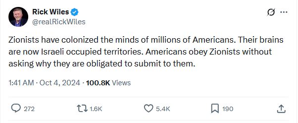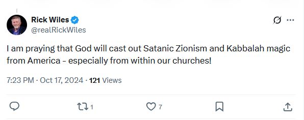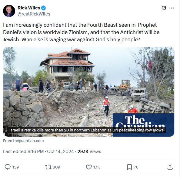 L’Anti-Defamation League (ADL), l’organisation américaine de lutte contre l'antisémitisme, souligne que le pasteur ne fait pas de distinction entre les termes « Juifs », « Sionistes » et « Israéliens » qu’il emploie de manière interchangeable, par exemple le 23 octobre 2024, lorsqu'il commente sur X les massacres du 7 octobre 2023 perpétrés par le Hamas en Israël et le conflit qui s’en est suivi : « Je n’ai pas de mots imprimables pour décrire le mépris que j’ai pour les cochons sionistes qui ont causé la souffrance et la mort de tant d’enfants. Les Juifs veulent que tous les enfants de Gaza meurent. Si vous ne pensez pas que les sionistes sont mauvais et méchants, c’est parce que vous êtes mauvais et méchants vous aussi. » La veille, toujours sur X, il écrivait : « Les Juifs sionistes ont transformé notre monde en enfer cette année. Les êtres humains dotés d’une conscience ne peuvent pas fermer les yeux pendant que les Juifs laissent mourir de faim des enfants. Gaza est le pire holocauste depuis la Seconde Guerre mondiale – et cette fois ce sont les Juifs les tueurs ! »