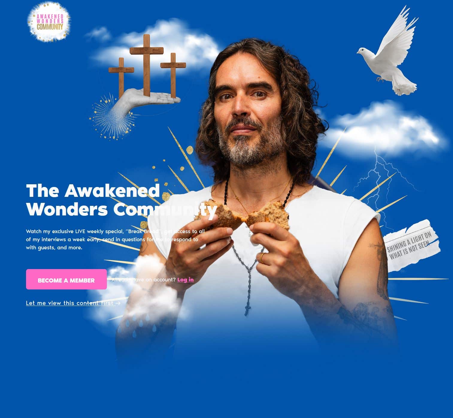 Cheveux longs, barbe de plusieurs jours et chemise ouverte (sa marque de fabrique), pain en main et croix chrétienne, Brand donne l’impression de s’adresser à ses abonnés depuis le ciel lorsqu’il les invite à écouter ses rencontres hebdomadaires « Break Bread » [« Rompre le pain »] sur le site conservateur Locals. Cette émission est, pour Russell Brand, l’occasion de « créer un espace dans lequel [il] peut parler de sa foi en profondeur ».