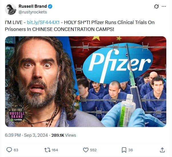 Mais c’est durant la pandémie de Covid-19 qu’il a opéré un virage définitivement complotiste. C’est à ce moment-là que Brand explose sur les réseaux sociaux. À la fin de l’année 2021, son audience YouTube avait presque doublé, atteignant près de 5 millions d’abonnés. Ses sujets de prédilection sont ainsi devenus la pandémie, « Big Pharma », le « Great Reset », la guerre en Ukraine et le « Deep State ».