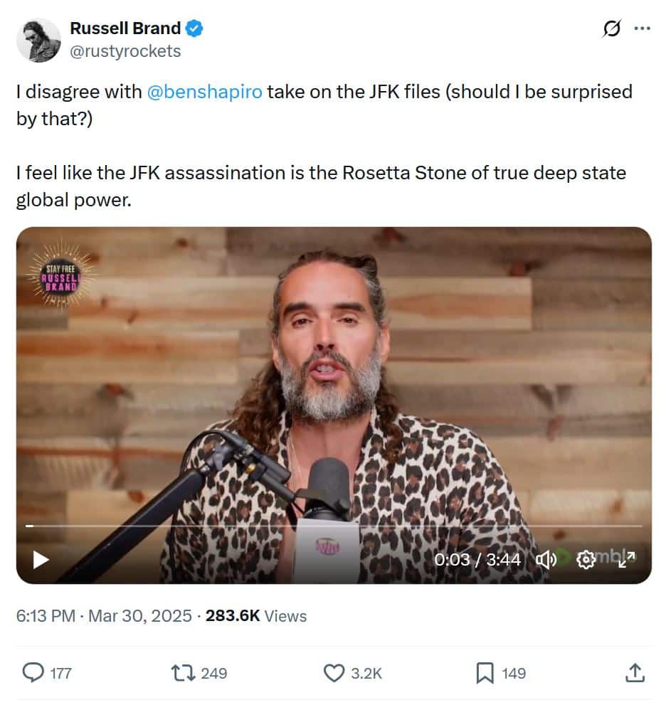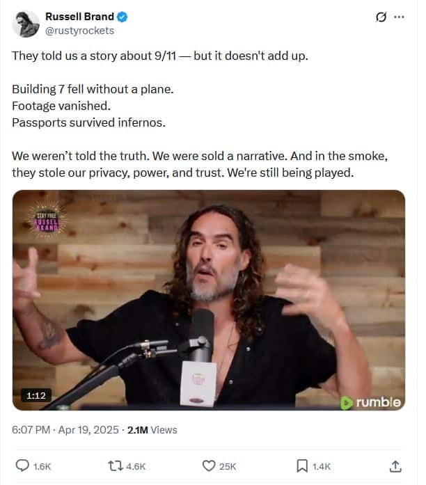 Russell Brand se considère également comme étant personnellement victime de conspirations. Depuis son inculpation par la justice britannique pour viol et agressions sexuelles, il évoque non seulement Dieu lorsqu’il se prononce sur le sujet, mais également une « machination obscure » qui aurait été mise en place pour lui nuire.