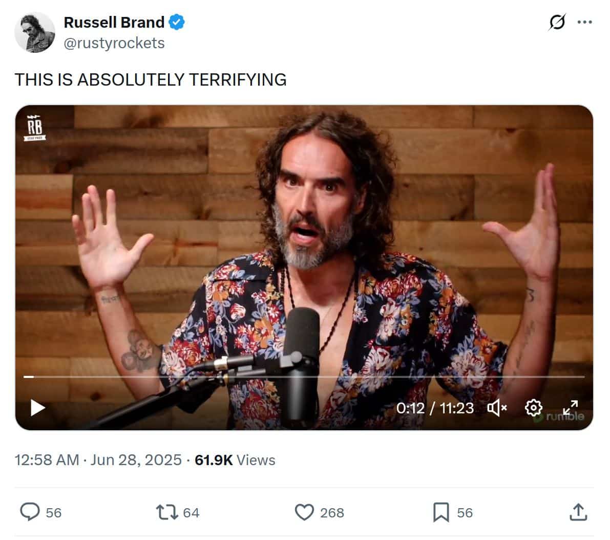 Quelques jours plus tard, discourant sur les crimes pour lesquels il a été jugé, Brand incite ses followers à ne « pas croire la culture », l’une des « institutions » qui se seraient liguées contre lui, mais de « croire en Dieu ».