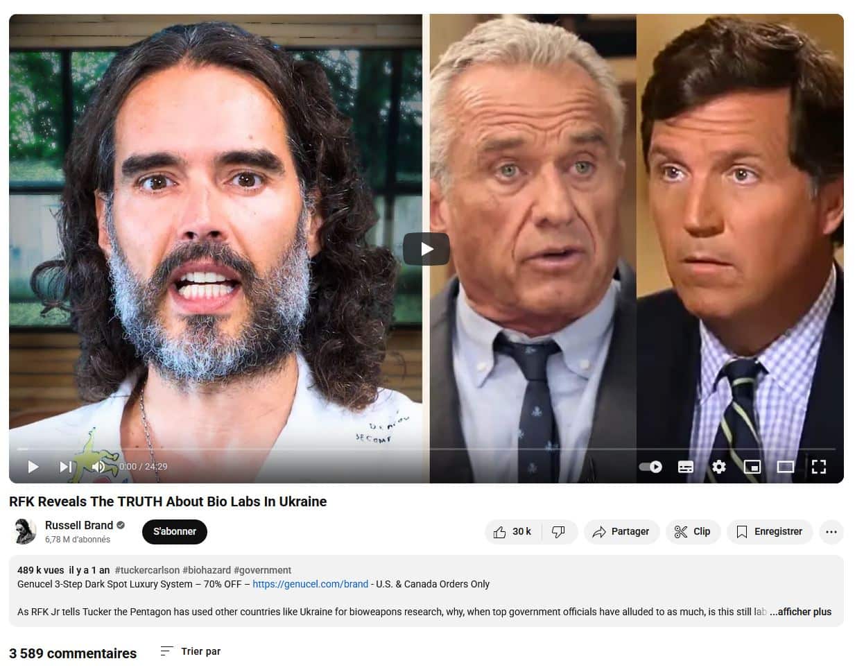 Pour sa première vidéo, c’est sans surprise que le comédien s’entretenait avec Tucker Carlson, figure de la complosphère conservatrice américaine. En effet, la conversion au christianisme de Brand l’a rapproché de la droite identitaire américaine.