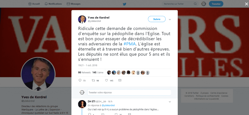 Au cours du week-end, l’hebdomadaire Témoignage chrétien (TC) a lancé un appel pour la création d'une commission d’enquête parlementaire visant à faire toute la transparence sur les abus sexuels sur mineurs et leur dissimulation dans l’Eglise catholique. Parmi les signataires de ce texte, l'ancienne ministre Roselyne Bachelot ou encore les avocats Jean-Pierre Mignard et William Bourdon, fondateurs de l'association de victimes La parole libérée. Pour certains cependant, cet appel n'a rien à voir avec les scandales de pédophilie auxquels l'Eglise est confrontée actuellement. Il se serait qu'une ruse visant à jeter le discrédit sur les opposants à l'extension de la procréation médicalement assistée (PMA) aux couples de femmes et aux femmes seules ! Dans un tweet publié hier soir, Yves de Kerdrel, l'ancien directeur de la publication de Valeurs actuelles, estime ainsi que « cette demande de commission d’enquête sur la pédophilie dans l’Eglise » est« ridicule » et que « tout est bon pour essayer de décrédibiliser les vrais adversaires de la #PMA ».