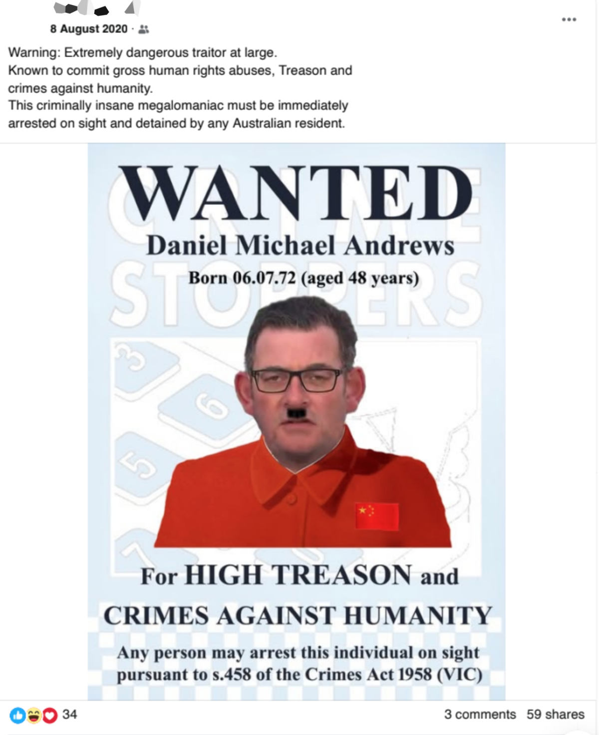 Sur Facebook, Desmond Filby s'en prend à Daniel Andrews (source : Crikey, 29/08/2025).