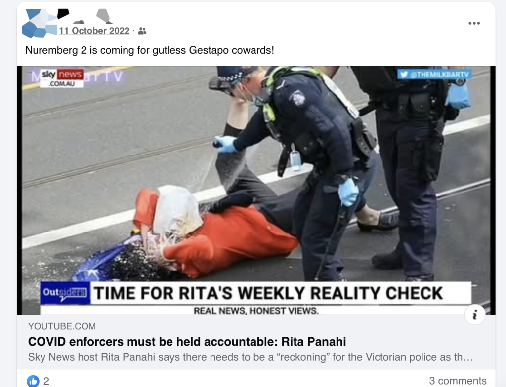 L'année dernière, devant la Cour suprême de Victoria, où il contestait l'annulation de son permis, il a déclaré : « La simple vue d'un policier ou d'une voiture de police… c'est comme si un survivant d'Auschwitz voyait un soldat nazi »... Au fil des années, sa détestation des forces de l'ordre s'est accentuée. Durant ses différentes actions en justice, il a qualifié les policiers de « sales nazis » et de « criminels terroristes », les a accusés de faire partie de la « Gestapo », et a affirmé qu’ils portaient des « pentacles sataniques » sur leurs uniformes. En 2023, il écrivait sur Instagram qu'un « bon flic est un flic mort ». Il a également appelé à « l'extermination des politiciens ».