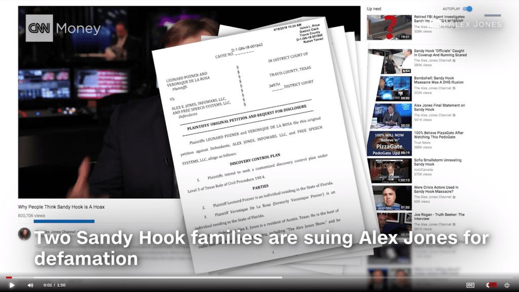 En août 2018, les parents et proches de victimes du massacre de l'école Sandy Hook à Newtown (Connecticut) avaient engagé une action en justice contre Alex Jones et ses collaborateurs, accusés d'avoir propagé, dans un but essentiellement lucratif, des théories du complot mensongères et diffamatoires sur le drame.