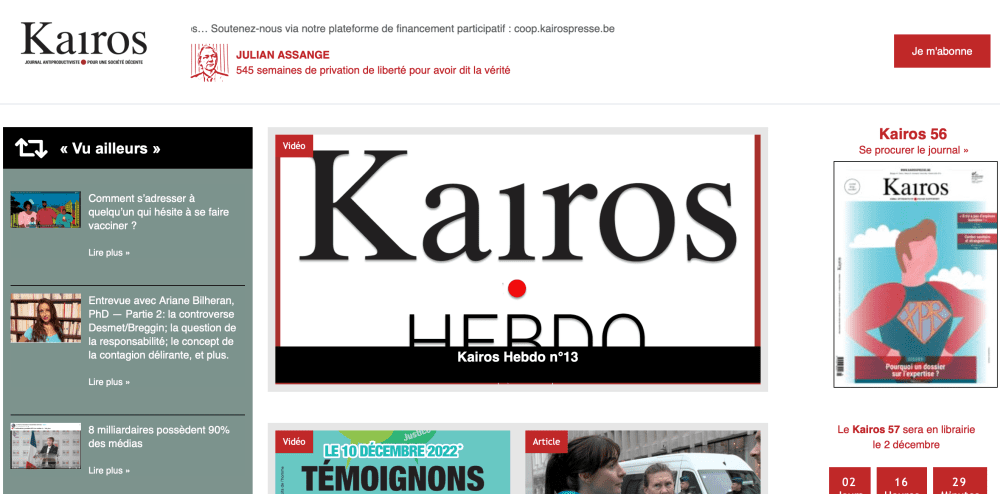 Kairos (kairospresse.be) est un site belge francophone lancé en 2012 et proposant des contenus à caractère conspirationniste. Kairos se présente comme un « journal antiproductiviste • pour une société décente ». Il affiche ostensiblement son soutien au fondateur de Wikileaks…