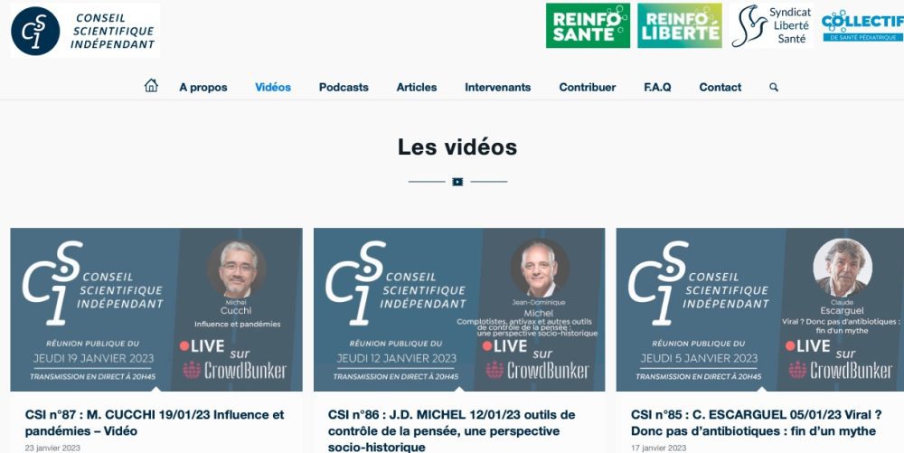 Le « Conseil scientifique indépendant » ou « CSI » est un collectif covido-sceptique regroupant des personnalités unies par leurs prises de position critiques à l'égard des mesures sanitaires prises lors de la pandémie de Covid-19 (confinement, gestes barrières, port du masque, passe sanitaire...), hostiles à la vaccination contre cette maladie ou favorables à des traitements n'ayant […]