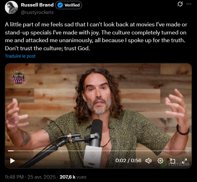 Une trajectoire à mettre en parallèle avec celle de Russell Brand. Le comédien, humoriste et animateur britannique, habitué des polémiques, débute sur Internet en 2014. À la faveur de la pandémie de Covid-19, il relance une carrière déclinante en propageant de multiples théories du complot. Très vite, il s'impose comme l'un des mastodontes du milieu, cumulant des millions d'abonnés sur les différentes plateformes. En 2023, le trublion est accusé par quatre femmes. La police ouvre une enquête et Russell Brand est finalement mis en examen en mai 2025 pour viol, agressions sexuelles et attentat à la pudeur. S'il reconnaît avoir été « un toxicomane », un « accro au sexe » et « un imbécile », l'ex-mari de la popstar Katy Perry nie les faits. Il évoque également une « machination obscure » qui aurait été mise en place pour lui nuire, déplorant que la loi soit devenue « une arme » et estime avoir été victime d'une « attaque coordonnée ». Sur Rumble, Russell Brand assure que « les médias, le gouvernement et le pouvoir judiciaire » tentent de trouver « des moyens [de] l'attaquer et de [le] faire taire ». La raison ? Il serait devenu « gênant »...